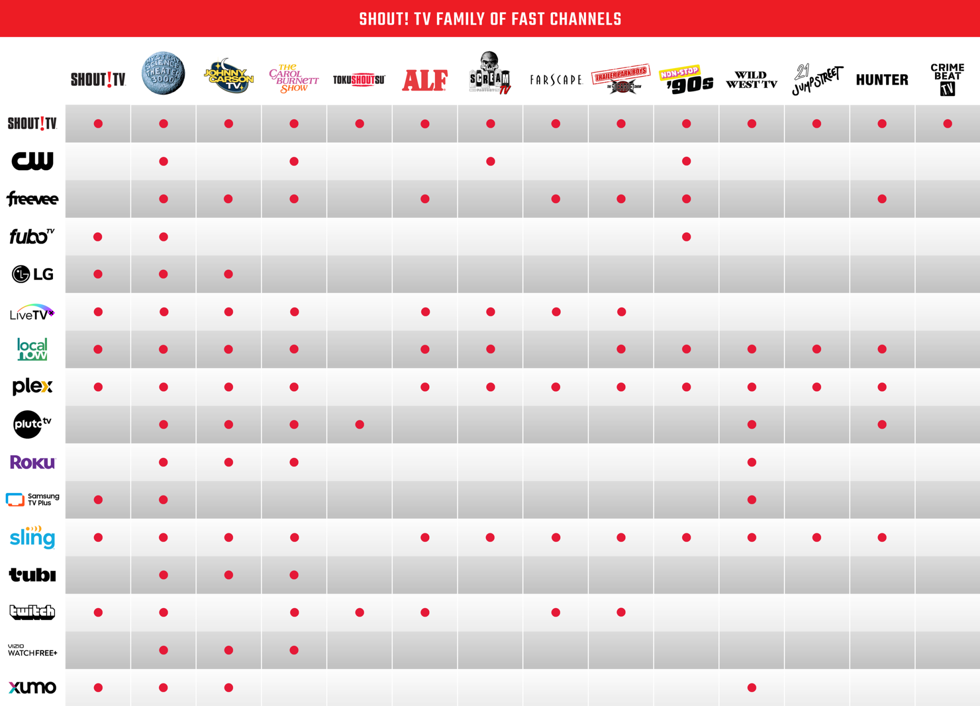 Since 2015, Shout! TV has brought an unrivaled blend of classic and cult movies and TV series, as well as its own original programming, to pop-culture fans. The streaming service distributes professionally produced content from major studios, independent producers, and its own distinctive entertainment library and makes it available on demand and on FAST channels, including Shout! TV, Mystery Science Theater 3000, Johnny Carson TV, The Carol Burnett Show, Farscape, ALF, and more. Watch online at ShoutFactoryTV.com or via multiple apps and branded channels.